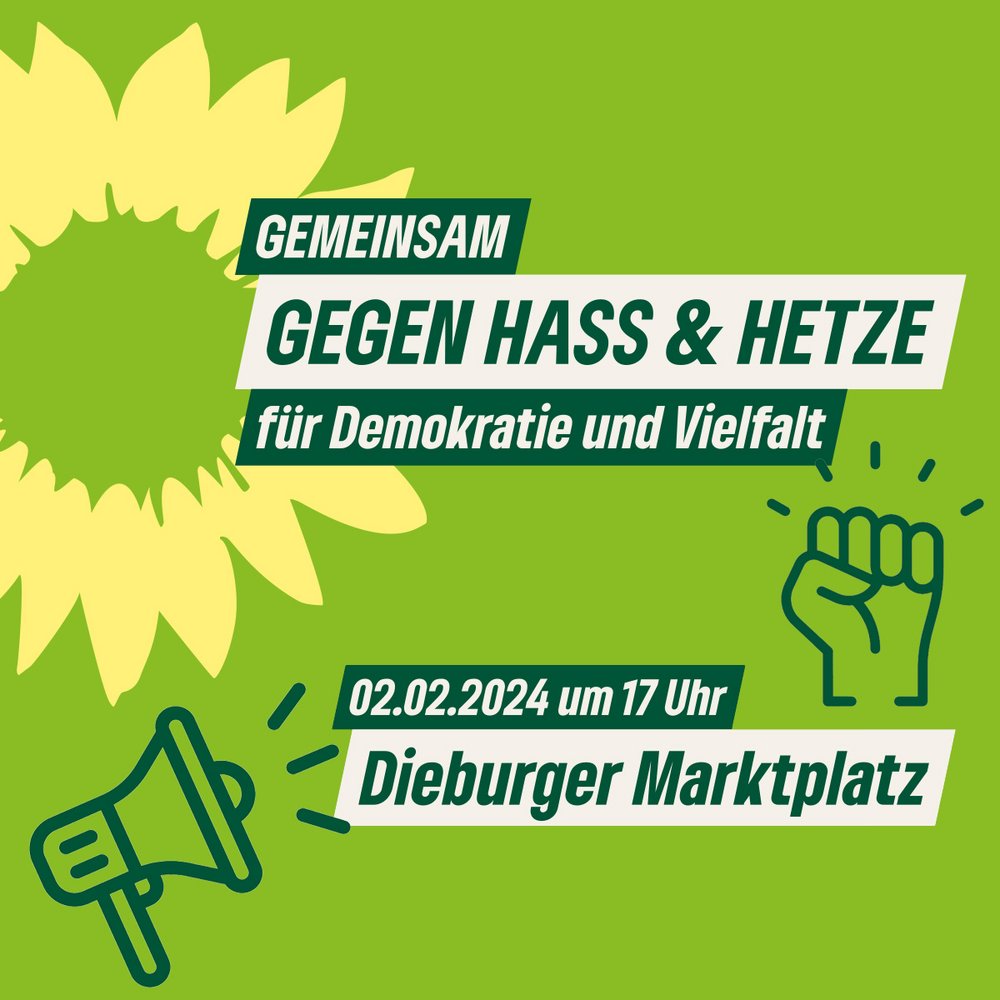 Alle in der Dieburger Stadtverordnetenversammlung vertretenen Fraktionen laden zu einer Kundgebung am Freitag, 02.02.2024 um 17:00 Uhr auf den Dieburger Marktplatz ein, um gemeinsam ein friedliches Zeichen für Rechtsstaat und Demokratie und gegen Hass und Hetze zu setzen.