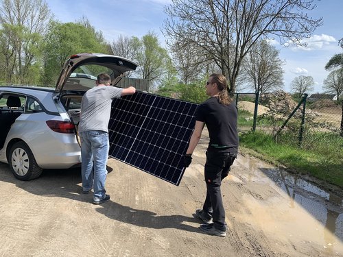 die Abholerinnen und Abholer beim Verladen der Module in ihre Autos und Anhänger.