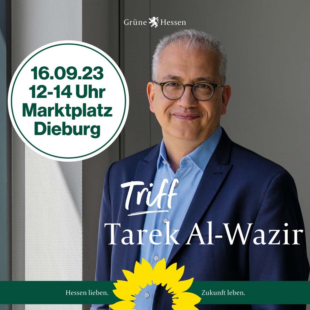 Der Spitzenkandidat der GRÜNEN in Hessen, Tarek Al-Wazir, besucht Dieburg am Samstag, 16.9.2023 zwischen 12.00 und 14.00 Uhr für einen persönlichen Austausch mit den Bürgerinnen und Bürgern. Der Wahlkampfauftritt wird gemeinsam vom Ortsverband Dieburg und dem Ortsverband Münster organisiert. Tarek Al-Wazir möchte die Menschen vor Ort über seine politischen Ziele informieren und für ihre Fragen zur Verfügung stehen. „Das ist eine gute Gelegenheit für alle Interessierten, mehr über die GRÜNE Politik zu erfahren“, sagt Gerhild Krause, Vorsitzende des Ortsverbands Dieburg. „Es ist wichtig, dass wir uns direkt an die Menschen wenden und die Kandidaten für den persönlichen Austausch zur Verfügung stehen“, ergänzt ihre Kollegin Sandra Pereira Heckwolf vom Ortsverband Münster.